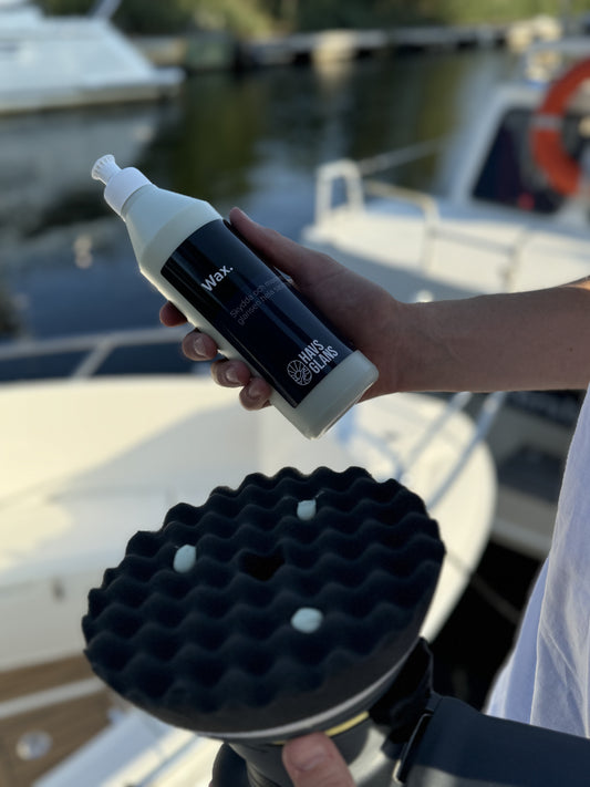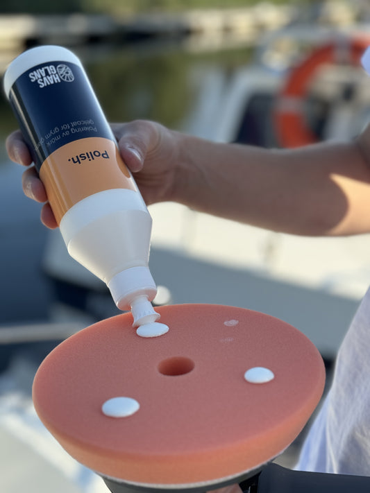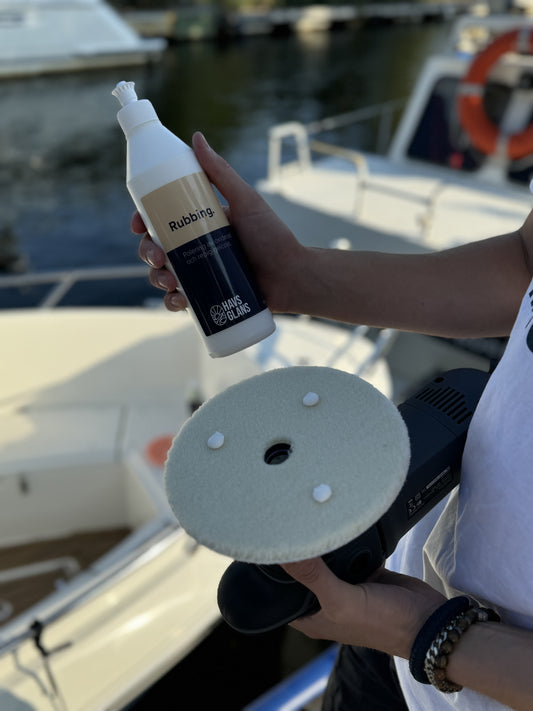 - Har du en båt med mörk gelcoat så polerar du med Polish och Polishtrissa efter Rubbingen och sedan skyddar med Wax.